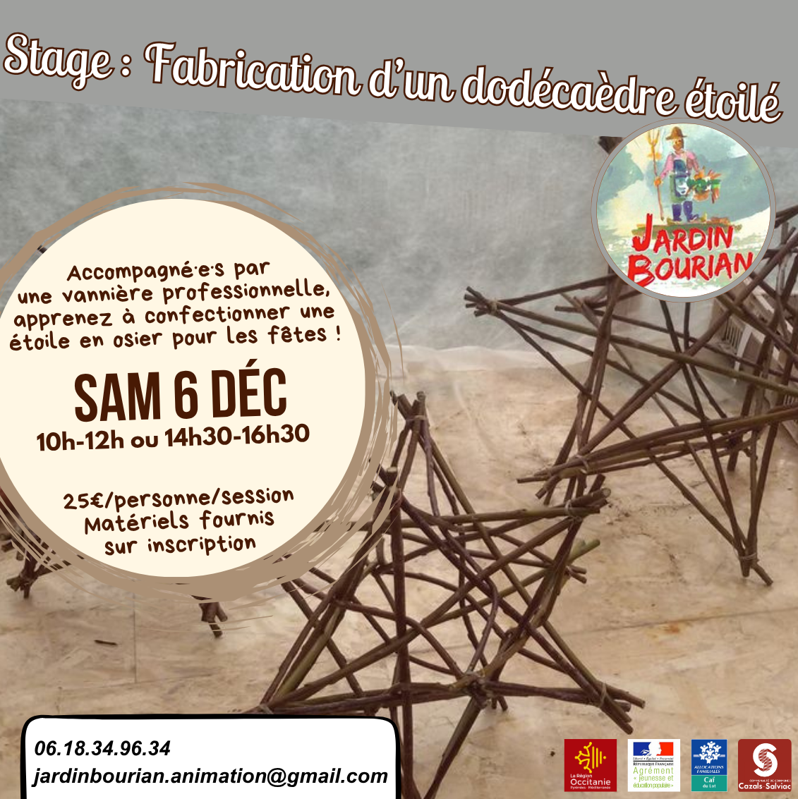 Lors d’une après-midi conviviale, Mapie, vannière professionnelle, vous propose d’apprendre à confectionner la plus jolie étoile qui soit pour les fêtes ! Et pas n’importe quelle étoile puisque celle-ci sera en trois dimensions et en osier ! Une belle occasion pour se familiariser avec ce matériau naturel agréable à travailler.