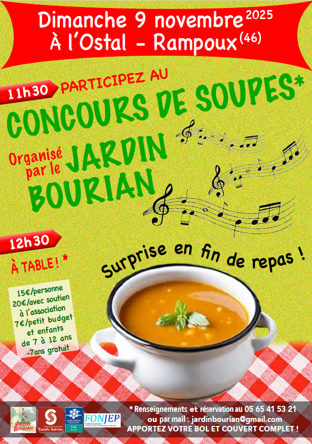 Inscrivez-vous sans tarder ou venez simplement déguster et voter pour la meilleure soupe ! Explosion des papilles garantie et surprise en fin de repas avec une animation “cup-song” de Claudio Geneste !