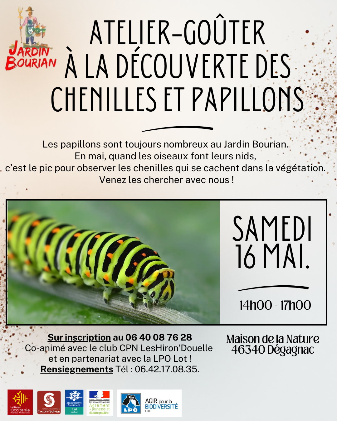 Atelier-goûter : Chenilles et papillons samedi 16 mai 2026 14:00 17:00 Jardin Bourian Cantelougue Dégagnac, Occitanie, 46340 France (carte) Google Agenda ICS