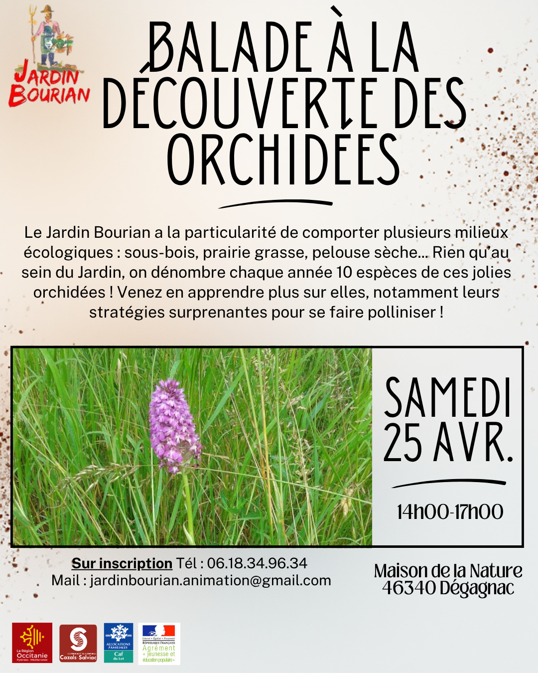 Balade à la découverte des orchidées samedi 25 avril 2026 14:00 17:00 Jardin Bourian Cantelougue Dégagnac, Occitanie, 46340 France (carte) Google Agenda ICS